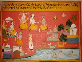 | Description / विवरण | Miniature painting based on Kashi khand depicting Vyas rishi praying to Mahadev and Ganesh. Shiv is seated on throne like a king. Some devotees are bathing in the Ganga. |
