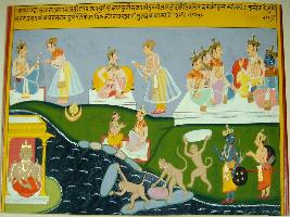 | Description / विवरण | Miniature painting based on Sarangatattva - an independent work of Sankhya school of philosophy depicting at the lower part Ram and Lakshman crossing the sea with the help of the monkey army. At the lower right corner twenty headed Ravan is seen. On the upper left corner Yudhisthir is seen with his brothers. At the upper centre and upper right two kings are talking to their messengers. At the centre of the painting a couple is seen. |