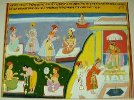 | Description / विवरण | Miniature painting based on Sarangatattva - an independent work of Sankhya school of philosophy. At the upper right side a man is talking to a man seated on an asana. Next to them also another man paying namaskara to a man sitting on an asana. Top of them a man is seen on his vahan. Below them at lower right side, a man is seen giving dana, while another man is looking at a mirror. At the left side a king is depicted sitting on a throne with a noble paying him a visit. |