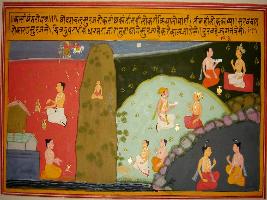 | Description / विवरण | Miniature painting based on Kashi khand depicting day scene on the right hand side of the painting and few people performing yagna. In the centre Vindhyanchal is painted, on its left night scene is depicted and two Naga depicted on the left lower corner of the painting. |