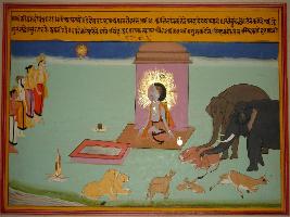 | Description / विवरण | Miniature painting based on Kashi khand depicting sage Agastsya Ashram. In the centre and he is seen seated. On its left Devendra seen standing with his Guru Brihaspati and other and on Ashram s left few wild animals are depicted. |