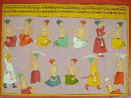 | Description / विवरण | Miniature painting based on Mahabharat - Rajdharma parva depicting Vyas telling Yudhisthir that killing a bad Brahman is not a sin, if soe one drinks wine at time of death is not a sinner. |