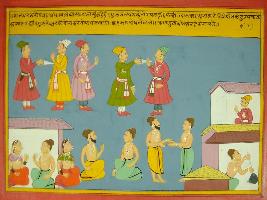 | Description / विवरण | Miniature painting based on Mahabharat - Rajdharma parva depicting Vyas telling Yudhisthir that touching of feet of Guru reduces our sins. He also says that stealing for the sake of Guru is also not a sin. |