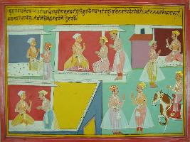 | Description / विवरण | Miniature painting based on Mahabharat - Udyam parva depicting Dhitrastra send his attendants to call Bindur, when Vidur come he told him that after hearing something from Sanjay he lost his sleep, he ask Vidur how is he, if he could sleep or not. |