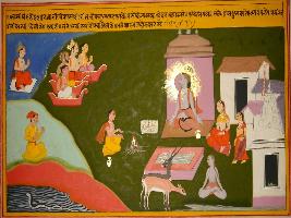 | Description / विवरण | Miniature painting based on Kashi khand depicting the scene of sage Agastsya Ashram and Indra and Devguru ask him to give a powerful weapon. |