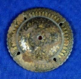 | Description / विवरण | Circular iron phool bob of a shield having golden koft work. The design is rubbed out. |