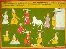 | Description / विवरण | Miniature painting based on Mahabharat - Rajdharma parva depicting Vyas telling king Yudhisthir that the ksatriya who do penance, do agnihoma walk with Veda and Bhojpatra by leaving wealth and home will get fruitfulness from it. |