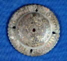 | Description / विवरण | Circular iron phool bob of a shield having golden koft work. The design is rubbed out. |