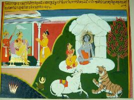 | Description / विवरण | Miniature painting based on Sarangatattva - an independent work of Sankhya school of philosophy. On the left side is the depiction of a king talking to one of his men and on the right is Shiv sitting in a cave with Parvati. Nandi and the tiger are also there. There is fire in the pond. |