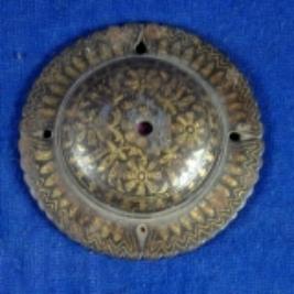 | Description / विवरण | Circular iron phool bob of a shield having golden koft work. The design is rubbed out. |