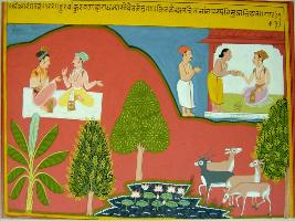 | Description / विवरण | Miniature painting based on Sarangatattva - an independent work of Sankhya school of philosophy depicting two men sitting and narrating scene at the upper right part. A king is shown giving alms to a Brahman and a needy person. Below this, deers are rooming peacefully and one is drinking water from lake. |