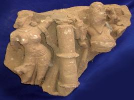 | Description / विवरण | Fragment of an independent sculpture, depicting Brahma on left side, he is depicted with beard, but completely defaced, lower portion is broken, there is female figure depicted besides Brahma on his right side, which is completely defaced. |