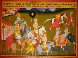 | Description / विवरण | Miniature painting based on Prithviraj Raso depicting Prithviraj s army is backing up by a Badshah mounting on an elephant. Some valour soldier are beating drums. |