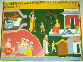 | Description / विवरण | Miniature painting based on Sarangatattva - an independent work of Sankhya school of philosophy. On the left side is the depiction of four cows sitting in a cowshed, a yogi sitting on tiger skin with three disciples, on the right is depiction of houses and women with their children. |