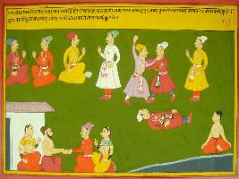 | Description / विवरण | Miniature painting based on Mahabharat - Rajdharma parva depicting Vyas says king Yudhisthir that a person can fulfil the wishes of his teacher guru by performing Mahavrata . Then he can also get rid of all sins. One who lies in front of his guru can get rid of it by performing these works liked by guru. |