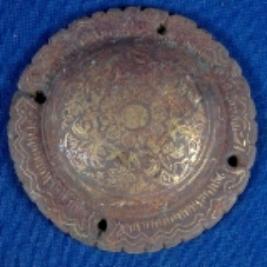 | Description / विवरण | Circular iron phool bob of a shield having golden koft work. The design is slightly rubbed out. |