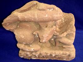 | Description / विवरण | Fragment of sculpture, depicting Shiva, seated on Nandi, the figure of Nandi is partially visible, because mutilated and leg of Shiva is seen on Nandi, upper body is broken, a seated figure has also is visible besides Nandi. |