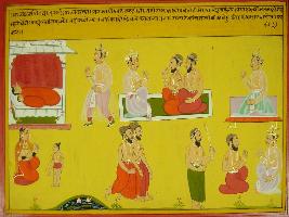 | Description / विवरण | Miniature painting based on Mahabharat - Rajdharma parva. Where Vyas tells a story to Yudhisthir that how a king achieved boon from two Brahman and got one daughter. The painting depicts the king and his queen and his child with two Brahmans. |