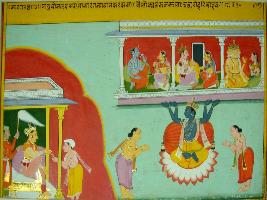 | Description / विवरण | Miniature painting based on Sarangatattva - an independent work of Sankhya school of philosophy. In the lower right portion, a king is giving alms to a Brahman. In the centre, four armed Vishnu is seated on Lotus and two devotees are paying homage to him. In the upper part, Shiv, Brahma and a king are depicted in three parts. |