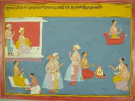 | Description / विवरण | Miniature painting based on Mahabharat - Udyam parva depicting always perform dharma by sacrificing yangna and against adharma always. |