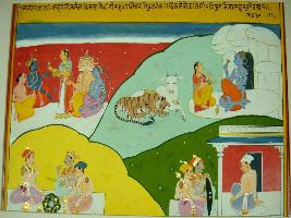 | Description / विवरण | Miniature painting based on Sarangatattva - an independent work of Sankhya school of philosophy. In the upper right corner, Brahma, Vishnu and Shiv with Narad are seated and a female is offering wine to them. In the lower right, three males are eating. In lower left, three warriors are seated and talking. In upper left part, Shiv is sitting with Parvati. Nandi and tiger are also seated in front of them. |