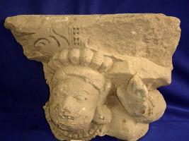 | Description / विवरण | Fragment of sculpture, depicting male figure adorned with necklace and earrings, also depicting with head gear, and a part of left hand with bracelet. It is probably Bhanvahak Gandharvas uplifting pillar with his head and hands. |