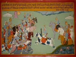 | Description / विवरण | Miniature painting based on Prithviraj Raso depicting army of Panga on the right side of the painting, while on the left Prithviraj and Sanjogita with their nobles is depicted. Painting glorifies the horse of Prithviraj. |