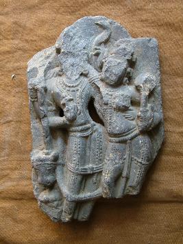 | Description / विवरण | This fragment is having images of Hara-Parvati in Tribhangi posture. Both are shown ornamented. Shiva in holding a trident with right hand and touching Parvati with left hand. Parvati is holding an unidentified object with left hand. Bellow the trident a head of bull can be seen. |