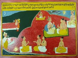 | Description / विवरण | Miniature painting based on Mahabharat - Udyam parva. Shiv is depicted here sitting with many gods and Gandharvas. Demons are also depicted doing their own Karma, Rishi to ton Brahmacharya that is their Karma, so every body should do their own Karma properly. |