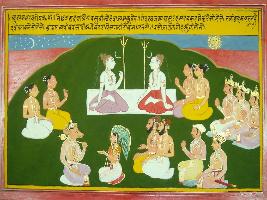 | Description / विवरण | Miniature painting based on Mahabharat - Udyam parva depicting the various Karmas assigned to various people sun and moon rised and sets that their karma, Vishnu made aware Indra of coming danger that their karma, rishisdo bramacharya that s their karma. |