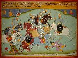 | Description / विवरण | Miniature painting based on Prithviraj Raso depicting the fight between Prithviraj Chauhan and Muslim forces. |