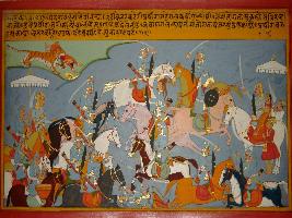 | Description / विवरण | Miniature painting based on Prithviraj Raso depicting the vigorous fight fought between Prithviraj and king Panga while Prithviraj eloping Sanjogita. |