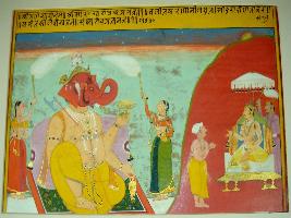| Description / विवरण | Miniature painting based on Sarangatattva - an independent work of Sankhya school of philosophy depicting Ganesh with his attributes and a bowl of laddu, sitting on a couch, flanked by two female chauri bearers. At the left side a king is seen sitting on a throne and talking to a man. A male chauri bearer is seen behind him. |