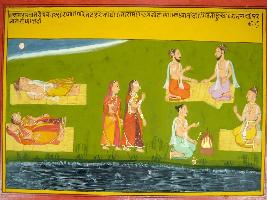 | Description / विवरण | Miniature painting based on Mahabharat - Ashramvas parva depicting Dhritrashtra with Gandhari and Kunti going to vana after denunciating worldly life. They spent their day near the bank of Ganga river. They performed yagna and read Veda. They slept there in night. |