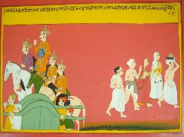 | Description / विवरण | Miniature painting based on Mahabharat - Ashramvas parva depicting Dhritrashtra leaving worldly life with Gandhari, Kunti and Sanjay and going to vana. Pandavas are shown returning back to Hastinapur at right part. |