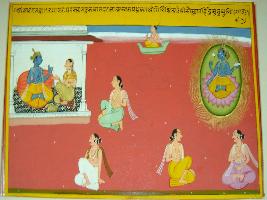 | Description / विवरण | Miniature painting based on Sarangatattva - an independent work of Sankhya school of philosophy depicting Krishna sitting with Radha and telling how one could reach to him. Many men are trying to do yoga in order to get Parmatma . |