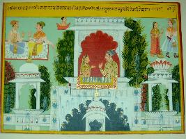| Description / विवरण | Miniature painting based on Sarangatattva - an independent work of Sankhya school of Philosophy. At the upper right corner two seated males are seen talking to each other. At the cnetre one couple is seen talking in a palatial balcony. At the upper left corner also one couple is seen. The palace is depicted elaborately. |