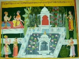 | Description / विवरण | Miniature painting based on Sarangatattva - an independent work of Sankhya school of philosophy. The painting is related to the human life depicting at the upper right two seated males talking to each other. Below them a couple is depicted talking. At the centre of the painting a huge fountain is seen in a garden, at the left side of which two standing females are seen. The painting is unfinished. |