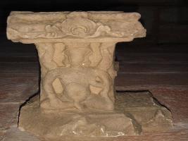 | Description / विवरण | A sculptured architectural fragment of a plinth depicts a seated celestial figure, which is completely defaced and mutilated. Attributes from right below 1 resting on thigh, 2 raised in sky to uplift load of plinth 3 raised in sky to uplift load of plinth. |