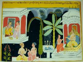 | Description / विवरण | Miniature painting based on Sarangatattva - an independent work of Sankhya school of philosophy depicting a couple sitting on a couch in a palace. Below them, two males are talking to each other. At the extreme left a king is seen talking to a priest. At the back ground rainbow, dark clouds with lighting are depicted. The painting is basically narrating about unstable mind of human beings. |