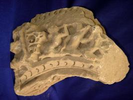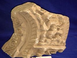 | Description / विवरण | Fragment of a panel, with the depicting flying Gandharvas, which are completely mutilated and defaced, floral designs. |