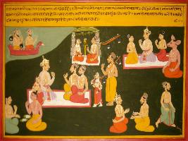| Description / विवरण | Miniature painting based on Mahabharat - Rajdharma parva. Vyas is depicted talking to Yudhisthir about king Sanjay. Here is depiction of many kings one including monkey king. |