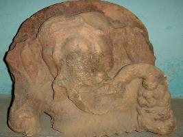 | Description / विवरण | Fragment of an independent sculpture of Ganesh, only the upper portion of the body is visible. His right hand is broken, while he is holding a bowl full of laddu in his left hand, end of the trunk is slightly broken, and is taking laddus from the bowl. The sculpture is seen with a nimbus. |