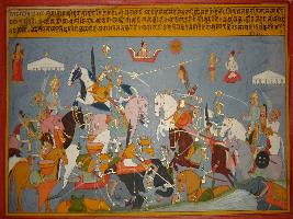 | Description / विवरण | Miniature painting based on Prithviraj Raso depicting a war scene between two armies fighting on horses and elephants with trishuls, bows and swords. kings of two sides are depicted seated on horse. |