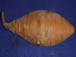 | Description / विवरण | Wooden bitter gourd, painted with brown colour, having ten incised circular rings and a curved stem. |