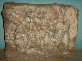 | Description / विवरण | Fragment of a sculpture, depicting a human body on an animal probably buffalo and a trident attacking an animal, It is probably depiction demon Mahishasur. Upper part of Mahishasur Mardini is missing. |