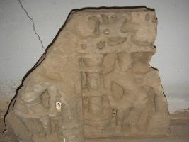 | Description / विवरण | A sculptured architectural fragment depicting two male figure in a niches and separated pillar. They are standing in trivanga pose. The upper part of the right figure is chopped off. He is holding the tussle of his drapery in his left hand. He is wearing armlet bracelet and necklace. The features of the left figure are rubbed out. |
