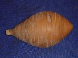 | Description / विवरण | Wooden bitter gourd, painted with brown colour, having twelve incised circular rings and a stem. The stem is partly broken. |