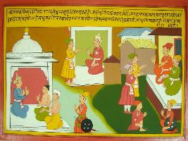 | Description / विवरण | Miniature painting based on Mahabharat - Ashramvas parva depicting Dhritrashtra telling Yudhisthir about Rajdharma. king should take day to day report from ministers. He should punished criminals. He should meet sages and Brahman early in morning and give good food to them. He should protect them and king who would follow and these instruction would go to swarg. |