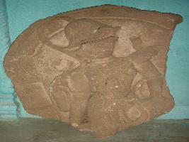 | Description / विवरण | Fragment of an independent sculpture, depicting the boar incarnation of lord Vishnu. Attributes from the right below- i Resting on his right thigh ii holding mace iii missing iv not visible. He is well adorned with jewellery. A floral canopy is also seen. |